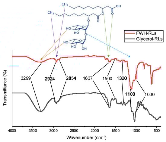 The RLs synthesized by B. thailandensis from different feedstocks had similar chemical signatures. Figure 4 shows typical FT-IR analysis of extracted RLs, which revealed the presence of conspicuous absorbance bands forming fingerprint regions specific to glycoplipids. Both glycerol and FWH-based biosurfactants have typical bands at 3299 cm−1 for the O-H group, amide N-H functions, and 2924 cm−1 for the aliphatic C-H group. The specific band at 2854 cm−1 infers to -C-H- vibrations of lipids. The specific band at 1637 cm−1 corresponds to C=O of ester and carboxylic acid groups. Further broad bands from 1320 cm−1 to 1500 cm−1 resemble δ(CH), asymmetric COO-, and broad C-H of CH2 and CH3 groups. Another strong absorption band between 1000 and 1100 cm−1 attributes to the -COC- group in rhamnose structure. This confirms the presence of rhamnose-type glycolipids as the extracted biosurfactant. Numerous other studies have also reported similar results for RLs [,].