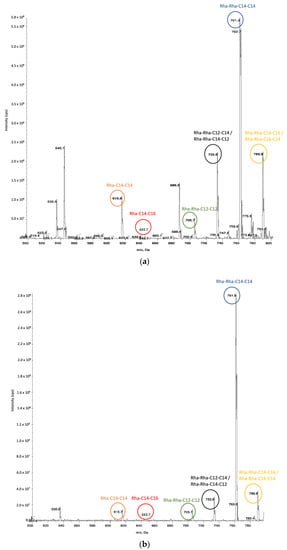 MS spectrum of rhamnolipids recovered from: (a) food waste hydrolysate; (b) pure glycerol fermentation broths.