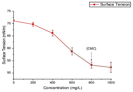 The surface tension measurement was performed by the BZY-B (BZY102) Automatic Surface Tensiometer using the du Noüy ring method. Subsequently, the different concentrations (0–1000 mg/L) of RLs dissolved in water were subjected to surface tension measurements for the estimation of the critical micelle concentration (CMC).