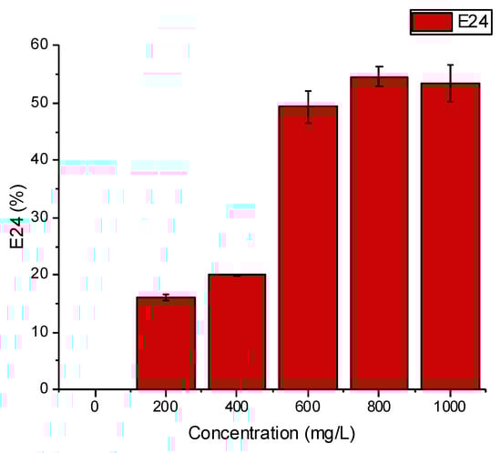 To evaluate the surfactant performance of FWH-derived RLs, the surface activity of the RLs mixture was measured. The CMC at which FWH-derived RL demonstrated maximum surface activity was 800 mg/L (Figure 6). In addition, the solution also achieved a surface tension reduction from 71.14 to 53.15 mN/m. Furthermore, the emulsification activity was also investigated, where the increase in RL concentration gradually improved the E24 and maximized at 54.6% at 800 mg/L concentration (Figure 7).