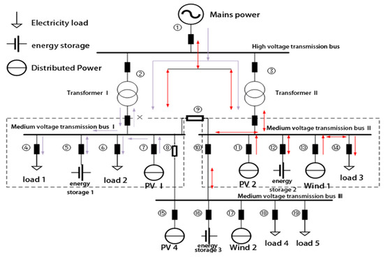 The traditional distribution network is designed according to the separation of power supply and load in the design plan. That means the power supply is sent from the fixed power network to the load center, which is in the area where the distribution busbar I is on the left side of Figure 8. The power flow output of photovoltaic and energy storage can only be within the busbar I area, and it needs to be calculated in conjunction with the main network power supply. If in the case of power failure of the main network without contact switches (⑧, ⑨), the power supply cannot be completed by the low-voltage reverse operation though the right distribution busbar II.