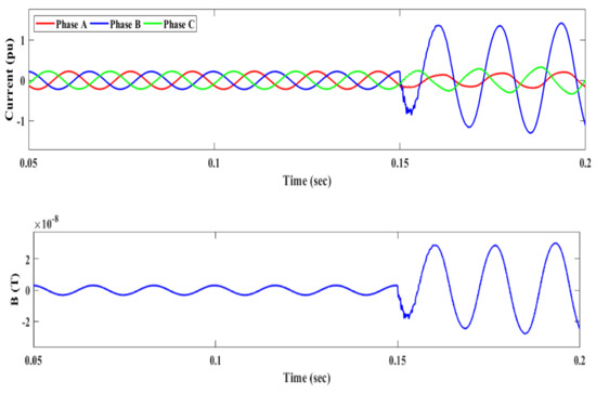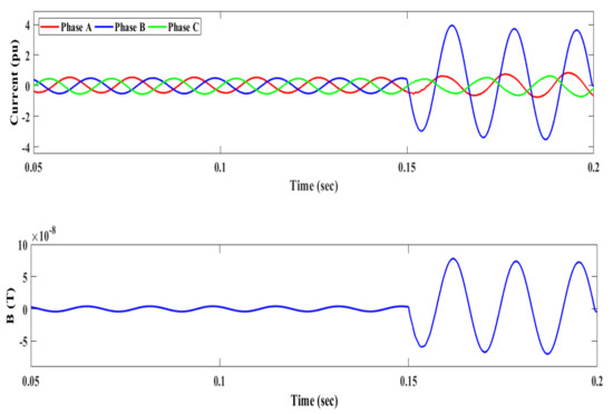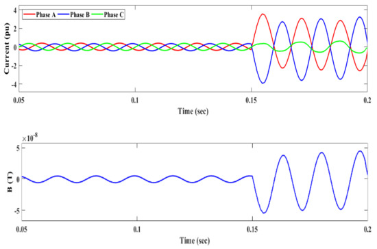 One of the main challenges that affect the performance of protection techniques is the detection of low levels of fault currents in the islanded mode of operation. Usually fault currents during islanded mode are of comparable magnitude to load currents. To verify the operation of the proposed protection scheme, multiple faults have been initiated in the islanded mode also by opening the connection of breakers from the PCC. Figure 10 shows the current and magnetic field when an LG fault is observed at DL-5 of the test microgrid. On the basis of change in magnetic field at the time of fault, THD is calculated. The figure clearly shows that THD is higher than the set threshold value, indicating a fault situation. Moreover, Figure 11 indicates that the fault is forward at DL-5, as the relay at both ends of the line calculates SRE as “1”, indicating the faulty region of the system thus tripping the faulty phase by sending the trip signal to the circuit breaker. The trip signal generated for the circuit breaker is shown in Figure 11.