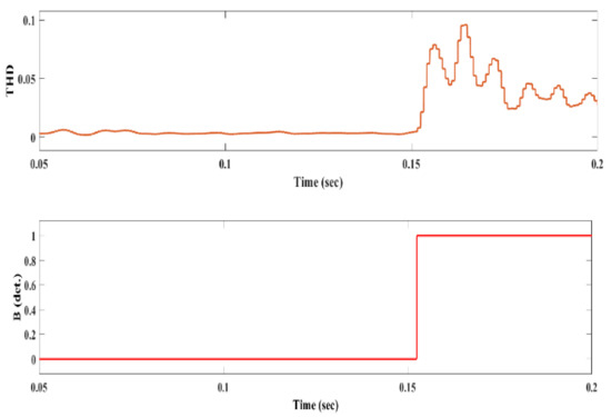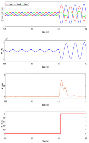 The proposed strategy is also tested with multiple DGs connected at a time by changing the configuration of the microgrid during looped grid mode by closing the CB1 and CB2 shown in Figure 7. An LL fault is initiated at DL1. Figure 18 validates the results as the THD of magnetic field is higher than the set threshold value. Moreover, the results indicate that the fault is of forward type. Hence, the presented scheme can effectively trip the faulty phases by generating a trip signal from the circuit breaker within 3.5 cycles after the initiation of the fault.