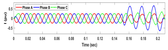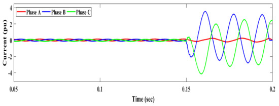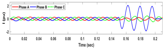 To validate and test the working of the protection scheme in islanded mode, three phase faults have also been examined at DL-2. As most of the DERs are iterative in nature, fluctuations have been noticed in the Figure 12 as the DERs’ output varies with time. Figure 12 and Figure 13 show the effectiveness of the proposed protection scheme. The results show that the proposed scheme can detect, localize and isolate faults within 3.5 cycles. Fluctuations in the output signals are due to the intermittent nature of the DERs, such as wind, solar panels, etc.