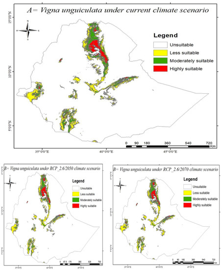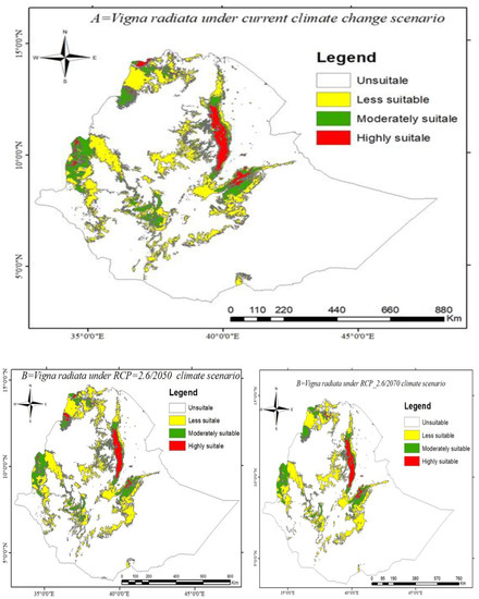 A study has examined the potential distribution suitability of the current and future agricultural areas for the sustainable production of V. radiata and V. unguiculata in Ethiopia. The maximum entropy model was used to analyze the potential suitable habitat for both crops in Ethiopia based on present and future sets of environmental factors. The adaptability of V. radiata and V. unguiculata habitat for current and future climate change scenarios was accurately modeled in this study. Final suitability work, from the total land areas of Ethiopia, highly suitable (1.69%), moderately suitable (4.27), less suitable (11.25%), and unsuitable (82.79%) habitat ranges for V. radiata are predicted, whereas V. unguiculata distribution in Ethiopia, highly suitable (1.27%), moderately suitable (3.07%), less suitable (5.22%), and 90.44% the study area was not suitable for V. unguiculata under the existing climate scenarios. The results revealed that the distribution, habitat suitability, and productivity of V. radiata were limited by the precipitation of the wettest quarter (Bio16), solar radiation index (SRI), and temperature seasonality (Bio4), whereas precipitation seasonality (Bio15), precipitation of the wettest quarter (Bio16), temperature annual range (Bio7), and precipitation of the driest quarter (Bio17) were found to be the most important environmental variables to define V. unguiculata habitat suitability in Ethiopia. Furthermore, the results showed that both crops adapted to wide ranges of agro-ecological areas of Ethiopia. Further distribution and production areas will be restricted as a result of climate change’s detrimental effects. Production and utilization of V. radiata and V. unguiculata crops in Ethiopia are very low, remaining below the potential of the crops and the world production average yield as compared to other major producing countries. Nevertheless, such crops make a significant contribution to the livelihood of the smallholder farming communities in Ethiopia, which have rapidly growing populations and need to meet their food needs. Knowing the current and future distribution of these economically important crops is critical to decide an appropriate production strategy that improves these crops’ production. This study could be useful to optimize these crops’ distribution and production in areas of high and moderate suitability where the crops are presently lacking. The habitat suitability map might be more realistic if more environmental covariates, such as anthropogenic threats were added, which will be strongly recommended for future researchers.