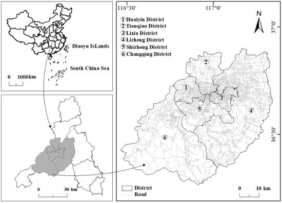 Jinan City is located in the central part of Shandong Province, between 36°02′ and 37°54′ N latitude and 116°21′ and 117°93′ E longitude. Jinan City has high topography in the south and low topography in the north and is within the warm temperate continental monsoon climate zone with four distinct seasons. As shown in Figure 1, Huaiyin, Tianqiao, Shizhong, Changqing, Lixia, and Licheng districts of Jinan City were selected as the study area.