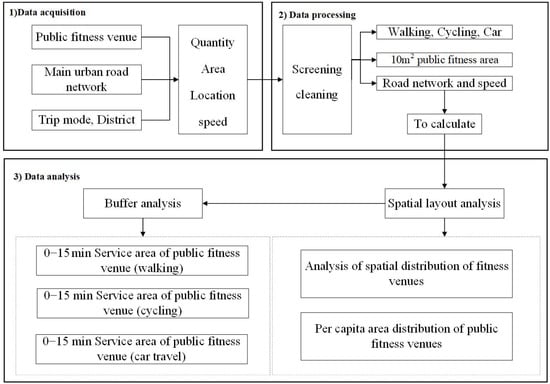 where P represents the ratio of public fitness venue service area; S2 is the area of each administrative district; S3 represents the area of public fitness venues in each administrative district; and S1 is the area of the public fitness venue service area. The formula calculates the ratio of public fitness venue service area for each administrative district. The work flow chart is shown in Figure 2.