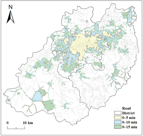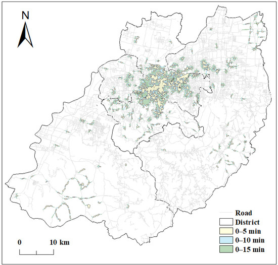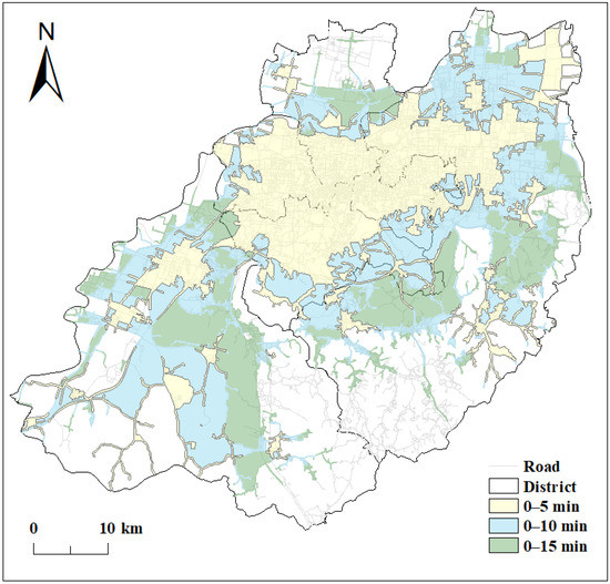 Therefore, the buffer zone analysis method was used in this study to calculate the service area of public fitness venues in each district within 0 to 15 min and the service area ratio based on the residents’ walking, cycling, and car travel, to analyze the accessibility of the 15 min fitness circle in each urban area.