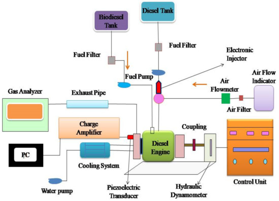 Figure 2 shows an experimental single-cylinder, air-cooled, vertical, direct-injection diesel engine. It generates 4.4 kW at 1500 rpm and is linked to an eddy current dynamometer. An anti-pulsating drum, an air heater, and air temperature measuring equipment are on the engine’s inlet components. An EGT indicator, an exhaust gas analyzer, and a smoke sampler are engine exhaust components. A separate fuel-measuring device assesses algae biodiesel blend usage. The test setup includes a 64-bit DAQ system to measure crank angle and cylinder pressure [34,35,36,37]. The data systems are used to find the combustion parameters. An AVL exhaust analyzer was used to determine the smoke opacity. Uncertainty was calculated in this study.