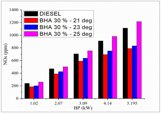 The variation in oxides of nitrogen and all the tested fuels related to brake load under a full-load condition are shown in Figure 3. In general, the diesel engine produces lower oxides of nitrogen at starting load condition, and they increase under full-load condition. After adding the BHA antioxidants to the fuel, the oxides of nitrogen increase gradually compared with the neat diesel fuel because of increased oxygen content in the fuel [38]. The fuel blend B20 + 30% BHA (23 °bTDC) shows reduced oxides of nitrogen by 43% compared with the conventional fuel (D100) under peak load condition. This is the result of the cooling impact generated by high latent vaporization heat of BHA and greater oxygen content which produce a low peak temperature during the combustion process. B20 + 30% BHA (21 °bTDC) had 49% less oxides of nitrogen than diesel fuel as a result of the antioxidants’ ability to inhibit the formation of peroxyl-free radicals by reacting with aromatic amines. The fuel blend B20 + 30% BHA (25 °bTDC) had 9.9% greater NOx emissions compared with diesel fuels, which may be attributed to the creation of peroxyl-free radical forms and an increase in the combustion temperature. An unpaired electron in a molecule, known as a free radical, determines the rate of oxidation for that molecule.