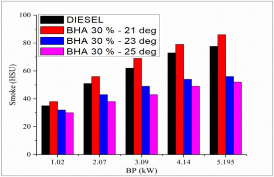 The variation in smoke opacity and all the tested fuels related to brake load at full-load condition is shown in Figure 4. Smoke opacity emissions are high in the neat biodiesel compared with all the tested fuels. In previous studies, algae biodiesel showed a high smoke opacity [6,26]. Smoke opacity decreases when BHA antioxidants are combined with algae biodiesel and diesel fuel due to an increase in fuel oxygen in the blends and oxygen concentration, even in fuel-rich regions. At 23 °bTDC, diesel fuel shows less smoke opacity than B20 + 10% BHA–21 °bTDC fuel with standard injection timing. That could be due to the greater cetane number of diesel and the delay period resulting from the different injection timings of 23° and 21 °bTDC. At maximum engine loads, the 25 °bTDC fuel shows reduced smoke emissions compared with other fuels. The reason for minimal emissions is that the engine operated with the maximum extent of injection timing of 25 °bTDC, which increases the residence time for fuel and air mixing and results in clean, regulated combustion [39,40,41,42,43]. These combined actions finally reduce the smoke emitted by the advanced injection timing.