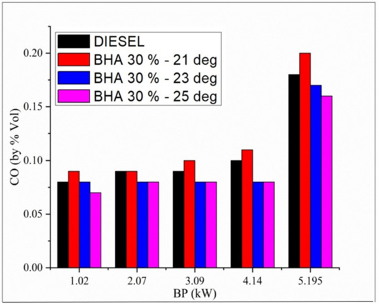 Figure 5 shows the variation of carbon monoxide and all the tested fuels related to brake load at full-load condition. Carbon monoxide is formed in the diesel engine because of incomplete combustion caused by the unavailability of oxygen content. Carbon monoxide emissions increase during engine start; however, the addition of BHA antioxidants to the fuel reduces carbon monoxide emissions in diesel engines. Owing to its short burning time and lack of preparation time in the combustion bowl, the blend B20 + 30% BHA (21 °bTDC) produces the highest carbon monoxide levels (0.21%) of all the tested fuels. The addition of BHA antioxidants and high temperatures under high-load conditions cause the blend B20 + 30% BHA (25 °bTDC) to show low emissions of 0.16% compared with diesel fuel [44,45,46,47,48]. A longer delay period enhances the spray pattern and atomization of fuel, which then enhances combustion in the cylinder.