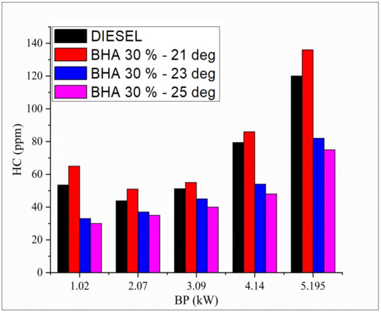 - Compared with regular diesel fuel, the blend B20 + 30% BHA (25 °bTDC) offers reduced hydrocarbon emissions. This finding might be ascribed to improved evaporation and a longer ignition delay, which improve preparation of the air–fuel mixture and result in a clean combustion.
