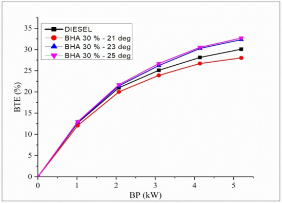 Deviations in BTE regarding brake power for the conflation impact of different injection timings with B20 + 30% BHA fuel are shown in Figure 7. Raw algal biodiesel has a low thermal efficiency compared with all other evaluated fuels due to the additional energy required to break down the significant hydrocarbon chains and the main aromatic compounds that comprise 40% of the algae. The BTE of B20 + 30% BHA (21° BTDC) is low in this test compared with all the fuels and all injection timings. It is connected with the retardation of fuel injection timing at 21 °bTDC in the engine. Fuel injection retardation has insufficient time for air–fuel mixing, and poor combustion is noted. In contrast, advancing the fuel injection timing at 23° and 25 °bTDC results in an improved combustion process, and hence, a higher BTE is observed [53,54]. This is due to enough residence time for air–fuel mixture preparation in the cylinder with a longer combustion duration.