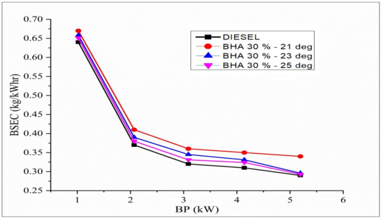 The trend for BSFC variation in brake power for different injection timings and with B20 + 30% BHA (21 °bTDC) fuels is shown in Figure 8. The calorific content exerts an important effect on fuel consumption. At a regular injection timing of 23 °bTDC, the BSEC of standard diesel fuel is comparable to that of all other fuels. B20 + 30% BHA (21 °bTDC) has greater BSEC than diesel due to retarded fuel injection pressure at 21 °bTDC. While the retardation process has a higher combustion temperature and pressure, it does not have sufficient time for complete burning. Hence, a more significant amount of fuel is consumed during the retardation process. B20 + 30% BHA (25 °bTDC) has lesser BSEC compared with B20 + 30% BHA (21 °bTDC) and B20 + 30% BHA (23 °bTDC). This result is due to the practical usage of fuel by keeping the burning process very close to TDC, which improves evaporation in the bowl. Hence, a lower BSEC is observed for the biodiesel blend at peak load.