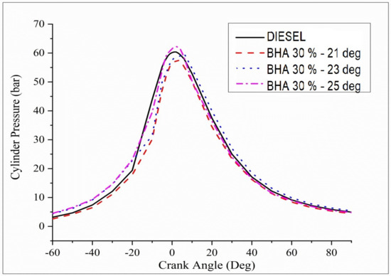 - Fuel at 25 °bTDC with B20 + 30% BHA increases cylinder pressure, which is comparable to all other fuels and injection timings. The enhanced air–fuel mixing, evaporation rate, and ignition delay period created by a 25° injection timing are responsible for the higher performance.