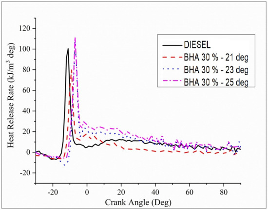 Figure 10 illustrates the differences between the heat release rate (HRR) and the crank angle for B20 + 30%BHA diesel fuels accompanied by B20 + 30% BHA (23° bTDC), B20 + 30% BHA (21 °bTDC), and B20 + 30% BHA (23 °bTDC). The HRR graph indicates that B20 + 30% BHA (21 °bTDC) has a lower magnitude compared with all the other fuels. This finding may be due to the presence of antioxidants in the fuel and a lower extent of injection timing of 21 °bTDC, which results in depressed combustion. TheB20 + 30% BHA (25 °bTDC) timing has maximum HRR in the cycle when it is equated with all other injection timings. This result is likely due to an increase in the delay period and the influence of HRR on the premixed burning phase and on the mixed-controlled burning phase, which results in an increase in HRR.