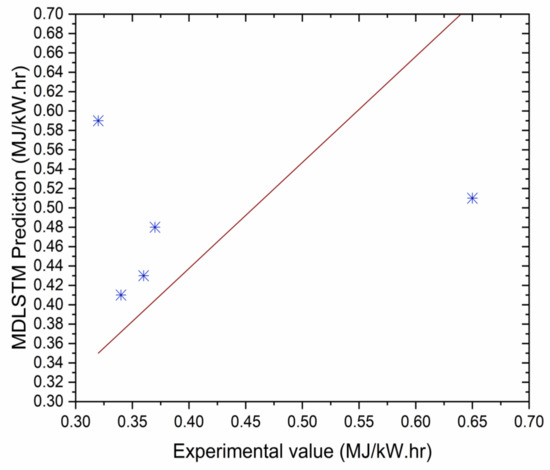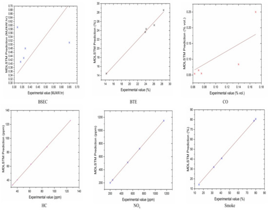 The authors made an MDLSTM model which predicted that the average RMSE would be under 0.38 and would be inside the proposed level. Additionally, the coefficient of determination (R2) was calculated to find the fitness of the MDLSTM regression model. The R2 values obtained for BTE, BSEC, CO, HC, NOx, and smoke are 0.9107, 0.9928, 0.8763, 0.9986, 0.9762, and 0.9928, respectively. Figure 11 shows overall combined graphs. The MDLSTM model has an average R2 value of 0.9579, which shows a good correlation between the predicted and experimental values. The correlation values for the experiments and the predicted values are shown in Figure 12, Figure 13, Figure 14, Figure 15, Figure 16 and Figure 17. This examination similarly upholds the data expected for the test results. The created MDLSTM model is seemingly a productive instrument that can foresee the boundaries of the engine that are exceptionally close to the trial results and limit trial and error cost, time, and intricacy related to an exploratory review.