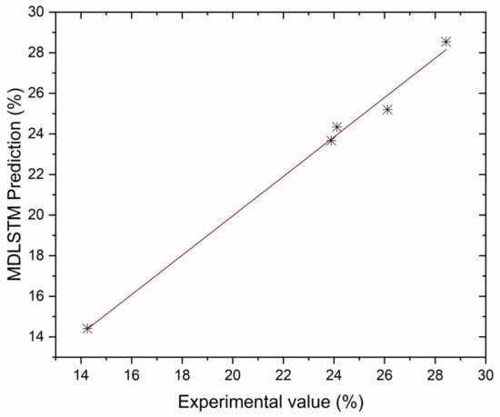 Correlation between MDLSTM predictions and experimental results for BTE.
