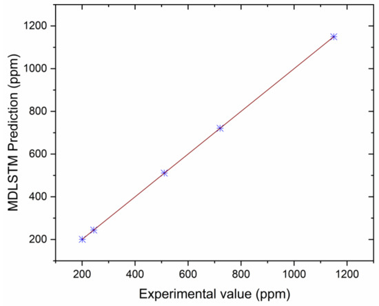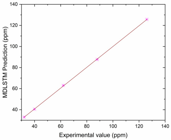 Correlation between MDLSTM predictions and experimental results for CO.