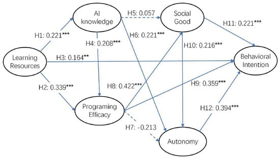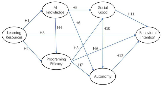 For the learning of AI to arrive at the stage where students can design some applications that can benefit others, students would need to acquire competencies in programming. The competence of programming is constituted of several sub-categories of skills, including coding algorithms, logical thinking, and debugging [38]. When students believe that they are able to program AI applications, they would logically be more inclined to believe that they are more able to lead an autonomous life in the AI age (H7), have the potential to promote social good with AI (H8), and can continue to learn more about AI (H9) [8].