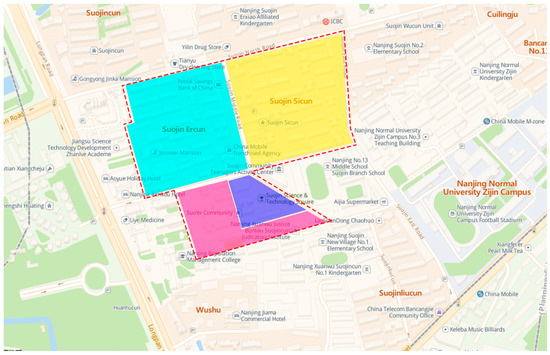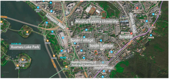 Nanjing, Jiangsu Province, is located in the lower reaches of the Yangtze River (31°14′~32°37′ N, 118°22′~119°14′ E) [11], 50–70 km from east to west and 150 km from north to south. Nanjing has a subtropical monsoon climate. With abundant rainfall, four distinct seasons, an average annual temperature of 15.4 °C and an average annual precipitation of 1106 mm, Nanjing is a blend of mountains, water, cities and forests, with a forest coverage rate of 26.4% and a green coverage rate of 45% in built-up areas [12]. The Xuanwu District is the largest central city in Nanjing, with an area of 80.97 km2. The community of Suojin Village was established in 1984, covering an area of 7 km2, an area with beautiful scenery and rich cultural heritage in the Xuanwu District (Figure 1 and Figure 2). As the “First Street of Happiness in Jinling,” Suojin Village creatively developed and implemented the “Harmonious Community Evaluation Guidelines,” which strongly promote harmonious community construction in Suojin Village, and created a harmonious community evaluation system at the street level in the country, which was highly valued and affirmed by the Ministry of Civil Affairs of China. “Suojin Sample,” a social construction brand, is well known nationwide.