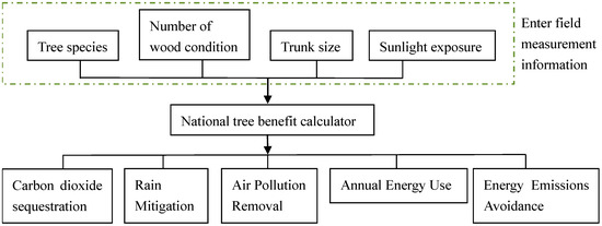 A national tree benefit calculator (NTBC) is an easy-to-use calculator to assess the benefits of a single family of trees based on i-Tree data. The annual carbon sequestration of the subject is estimated by converting the aboveground biomass into carbon sequestration. The annual carbon sequestration in this model is actually the annual increment in carbon stored in the form of biomass [14,15]. NTBC can estimate the present-day plant carbon sink benefits and aggregate the carbon sink benefits over 20 years.