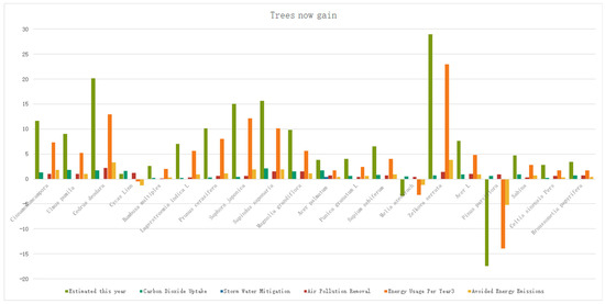 i-Tree provides the latest peer-reviewed urban forestry analysis and ecological benefit evaluation models of the USDA Forest Service to all types of users through free tools and web support [13]. To evaluate individual trees, My Tree, i-Tree Design and i-Tree Eco were used to derive estimates of individual tree benefits, and for canopy area assessment, Our Tree, i-Tree Landscape and i-Tree Canopy were used to estimate land and canopy cover as well as its benefits to facilitate the identification of landscape equity, climate priority plantings and protected areas. Graphs were produced regarding the structure, function and benefits of urban–rural vegetation, covering CO2 sequestration and storage, stormwater mitigation, etc., as well as research data showing the impact of the study objects on building energy consumption and indirect reductions in CO2 emissions and air pollution removal (Figure 6).
