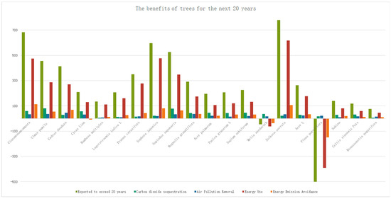 In the case of trees in generally good condition, the order of the trees according to their economic benefits in the current year is Zelkova serrata > Cedrus deodara > Sapindus saponaria > Sophora japonica > Cinnamomum camphora > Prunus cerasifera > Magnolia grandiflora > Ulmus pumila > Acer L. > Lagerstroemia indica L. > Sapium sebiferum > Sabina > Punica granatum L. > Acer palmatum > Sapium sebiferum > Celtis sinensis Pers > Bambusa multiplex > Cycas > Melia azedarach L. > Pinus parviflora, and that of the trees in the next 20 years is Zelkova serrata > Cinnamomum camphora > Sophora japonica > Sapindus saponaria > Ulmus pumila > Cedrus deodara > Prunus cerasifera >Magnolia grandiflora > Acer L. > Sapium sebiferum > Cycas >Punica granatum L. > Lagerstroemia indica L. > Acer palmatum Thunb > Sabina > Bambusa multiplex > Broussonetia papyrifera > Celtis sinensis Pers > Melia azedarach L. > Pinus parviflora. It can be seen that, in light of the ranking change of Cinnamomum camphora, Ulmus pumila, Cedrus deodara and Cycas Linn, combined with the characteristics of the plants’ own properties, Cinnamomum camphora has a well-developed root system, is more resistant to strong winds, has a slower growth rate and has a longer life span. If only analyzing the current year’s income, that of Cinnamomum camphora is not as good as that of acacias, but in 20~50 years, the economic benefits brought by camphor far exceed those of other existing tree species. Ulmus pumila is a masculine tree, has a fast growth rate and has a well-developed root system, with the former carbon sink benefits being average. The carbon sink benefits at an early planting stage are average, but with time, and considering that Ulmus pumila grows fast, the economic benefits can even surpass those of Cedrus deodara after 20 years. Cedrus deodara is an ornamental tree with a strong ability for dust and noise reduction due to its tall body and beautiful shape, so its carbon sink ability at an early planting stage is high. At a later stage, it is also in the middle to upper levels and can be planted in the main nodes or on both sides of a road, offering a spectacular display. The growth cycle of Cycas Linn is long, so there are carbon sink benefits at the beginning. The carbon sink benefits of Zelkova serrata are very long, so it is in the middle of the list after 20 years.