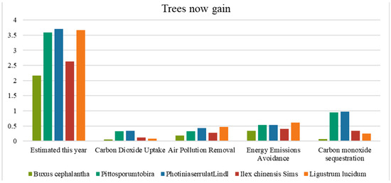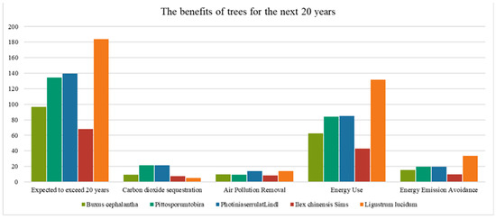In the case of equal tree conditions, the order of the trees according to their economic benefits in the current year is Photinia beauverdiana > Pittosporum tobira > Ligustrum lucidum > Viburnum odoratissimum > Buxus cephalantha, and that of trees according to their economic benefits for the next 20 years is Ligustrum lucidum > Photinia beauverdiana > Pittosporum tobira > Buxus cephalantha > Viburnum odoratissimumi. Ligustrum lucidum, as a deep-rooted species with strong resistance to atmospheric pollution and to gases such as sulfur dioxide, can also absorb hydrogen fluoride, chlorine and other toxic gases. Buxus cephalantha and Viburnum odoratissimum, widely used plant species, have a more prominent landscape effect and cultural value than their carbon sequestration effects.