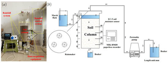 - Lin, S.J.; Jian, W.B.; Dou, H.Q.; Chen, R.M.; Chen, R.M.; Nie, W. Rainfall Infiltration Mechanisms of Soil Columns Under Conductivity. J. Eng. Geol. 2022, 30, 394–406. [Google Scholar]