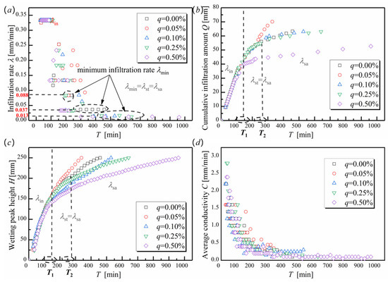 The soil sample with q of 0.05% did not represent stable infiltration, and the rainfall infiltration process showed no pressure infiltration or pressure infiltration. The rainfall infiltration shows three stages: no pressure infiltration, pressure infiltration, and saturated infiltration with regard to the q values of 0%, 0.1%, 0.25%, and 0.5%. According to Figure 2a,b and Table 1, in the no-pressure infiltration stage, the initial infiltration rates (λin) are constant and equal to the rainfall intensity. The water begins to accumulate on the soil column surface, and the surface soil enters a transient saturation state. The soil moisture content is low, and the matrix suction is large. The time–history curves represent slanted straight lines, and the average conductivity (C) is large, which means that rainwater is quickly absorbed and continuously transmitted to the interior of the soil. The no-pressure infiltration stage ends at T1 with the existence of the accumulation point as a symbol. In the pressure infiltration stage, the λ value gradually decays to a stable value with rainfall duration; that is, the infiltration rate (λst) is stable, and the water height on the soil column surface changes stepwise to a stable state. The soil mass on the surface transfers to a fully saturated state. The curves in Figure 2b show an upward convex shape. The increase in magnitude in wetting peak depth (H) also decreases gradually at the same time, and the C values begin to decrease rapidly with rainfall duration. The pressure stage ends at T2 with the existence of the saturated point as a symbol. In the saturated infiltration stage, the time–history curve of cumulative infiltration is a straight line, and its slope λ tends to be constant, which is the saturated infiltration rate (λsa) and is equal to the permeability coefficient of stable soil infiltration (λst = λsa = λmin). The soil column undergoes saturated infiltration, and the C value tends to be stable. According to Table 2, microplastics with a q of 0.05% promote rainfall infiltration, and the water accumulation time is much longer than that of the other test samples. For other microplastic content samples, the more q values there were, the earlier the water accumulation point and saturation point appeared.