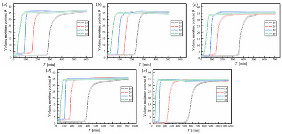 Time–history curve of volumetric moisture content θ at monitoring points with different microplastic contents q: (a) q = 0.00%; (b) q = 0.05%; (c) q = 0.10%; (d) q = 0.25%; (e) q = 0.50%.