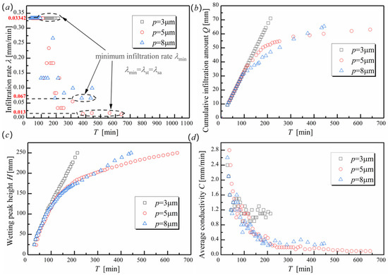 Time–history curve of under different microplastic particle sizes p: (a) infiltration rate λ; (b) cumulative infiltration amount Q; (c) wetting peak height H; (d) average conductivity C.