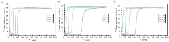 Time–history curve of volumetric moisture content θ at monitoring points with different microplastic contents p: (a) p = 3 μm; (b) p = 5 μm; (c) p = 8 μm.