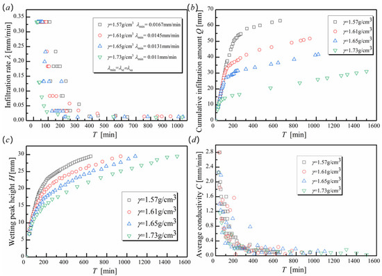 Time–history curve under different soil bulk density γ: (a) infiltration rate λ; (b) cumulative infiltration amount Q; (c) wetting peak height H; (d) average conductivity C.