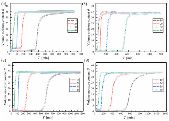 Time–history curve of volumetric moisture content θ at monitoring points with different soil bulk density γ: (a) γ = 1.57 g/cm3; (b) γ = 1.61 g/cm3; (c) γ = 1.65 g/cm3; (d) γ = 1.73 g/cm3.