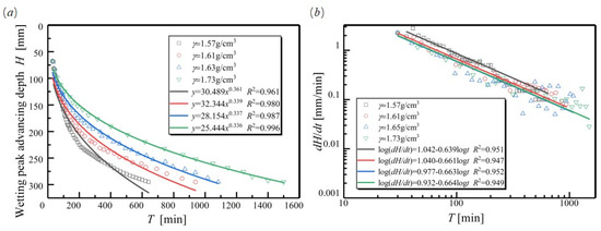 where dH/dt is the advancing speed of the wetting peak; log(ab) is related to the initial advancing speed of the wetting peak; and b − 1 is the slope of Equation (3) and is related to the acceleration of the wetting peak advance. Combined with Equation (1), the time–history curves of the wetting peak advancing depth H and the wetting peak advancing speed dH/dt are shown in Figure 8.