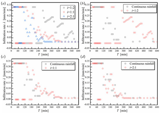 The rainfall infiltration rate (λ) is barely unchanged for more than 600 min of rainfall duration, and the rainfall infiltration is stable under the circumstances of three different rain interval ratios (i). Therefore, the time–history curves only represent rainfall duration within 600 min. As shown in Figure 9, the rainfall infiltration process overall does not show no-pressure infiltration, pressure infiltration, or saturated infiltration. With time, the rainwater infiltration rate (λ) gradually decreases to approximately 0.013 mm/min regardless of the difference in i values. However, at the same time, the time–history curves of λ from high to low rain interval ratios (i) are 1:2, 1:1, and 2:1 in turn. It could be speculated that the rain interval ratio (i) has little influence on the saturated infiltration stage of the soil. It is easier for rainwater to infiltrate into the soil inside, and there is no significant loss of rainwater through surface runoff when i is equal to 1:2.