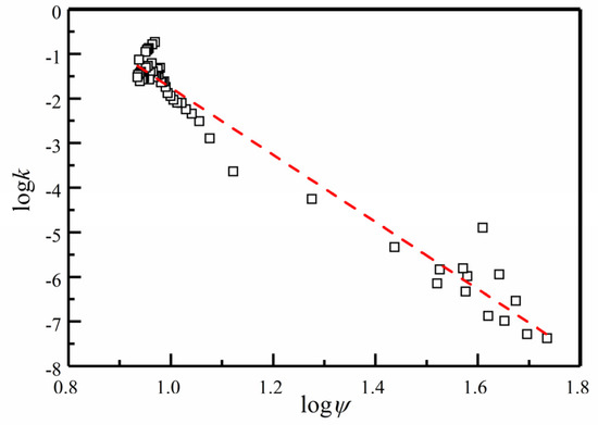 As shown in Figure 11, when the soil tends to be saturated, the matrix suction force ψ is small, and the permeability coefficient (k) is approximately equal to 0.0338 mm/min, which is in close proximity with the saturated permeability coefficient (λ) of 0.037 mm/min in Section 3.1. Therefore, the experimental results in this paper are consistent and reasonable with the theoretical calculation. Meanwhile, the distribution of the logarithm (lgk) and the matrix suction (lgφ) shows a linear distribution law, which can be fitted by a linear equation. The fitting curve under the double logarithmic coordinate is shown in Figure 11. The fitting equation is: