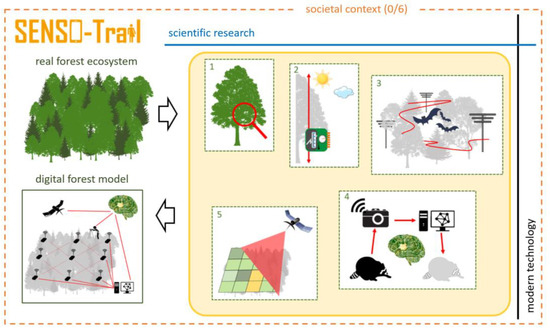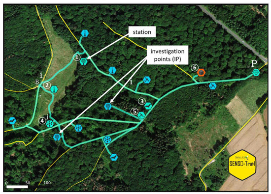 The SENSO Trail (Science Education and Natural System Observation) is implemented in the research and educational forest of Philipps University of Marburg in Germany. SENSO Trail is an educational concept in which approaches from digital nature trails, geocaching, open-air science education, and mDGBL are combined into an innovative adventure trail. The project was funded by the Hessian State Ministry for Higher Education, Research, and the Arts, Germany, as part of the LOEWE priority project Natur4.0—Sensing Biodiversity. In Natur4.0, natural and environmental research and modern technology are combined with approaches and perspectives from multiple disciplines on different scales [50,51]. For example, the physiology of a tree (1) is considered on an individual small-scale level first [52]; in the following step, it will be linked to the prevailing microclimates (2) on and around the tree [53]; and finally, in a further change of perspective, the tree’s role as a habit and its interaction with the animal world (3) is captured [54]. To combine several of these selective insights and to upscale them into a higher-level view of the whole ecosystem, the use of machine learning methods, A.I. (4), and remote sensing (5) come into play [55]. As can be seen in Figure 1, this selective consideration on varying scales within Natur4.0 was transferred into respective units of the SENSO Trail.