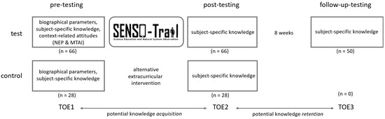 The control group was offered an alternative extracurricular program instead. Although their intervention took place in the forest as well and was related to geography and natural sciences too, care was taken to ensure that there were no intersections with the SENSO Trail concept. At the second time of enquiry (TOE2), directly after participation, SSK was tested once more in both groups. Only for the test group, there was a third time of enquiry (TOE3) approximately eight weeks after participation. In this follow-up, the SSK was tested a third and final time to analyze the long-term effects of the intervention.