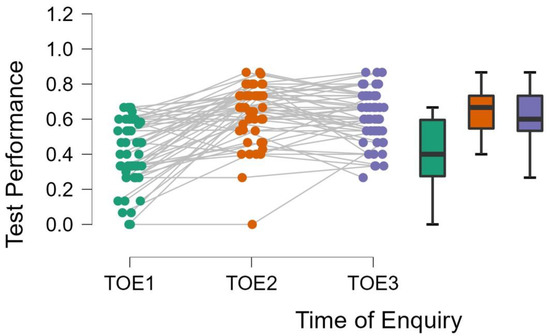 The repeated measures ANOVA on the test group (n = 50) shows significant differences (F (1.55, 1.64) = 46.47, p = 1.4127 × 10−13, ω2 = 0.26) between the 3 times of enquiry (TOE1 to 3). A Bonferroni-adjusted post hoc test reveals significant higher performances at TOE2 (MDiff = −0.2272, SE = 0.0258, t = −8.7932, pbonf = 1.5036 × 10−13) and TOE3 (MDiff = −0.2020, SE = 0.0258, t = −7.8198, pbonf = 1.8408 × 10−11) compared to TOE1, while there are no significant differences between TOE2 and 3 (MDiff = 0.0252, SE = 0.0258, t = 0.9734, pbonf = 0.9983). As can be seen in Figure 4, in most cases the score after the intervention is higher than before and even stays on average the same level at the follow-up test (see Table 1).
