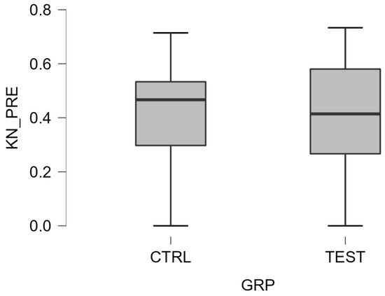 Independent measures ANOVA showed no significant differences in prior knowledge (KN_PRE) of the tested content between the test and control groups (F (1, 92) = 0.0026, p = 0.9593, ω2 = 0.00), as can be seen in Figure 5. With regard to previous knowledge, the same prerequisites are given in both groups.