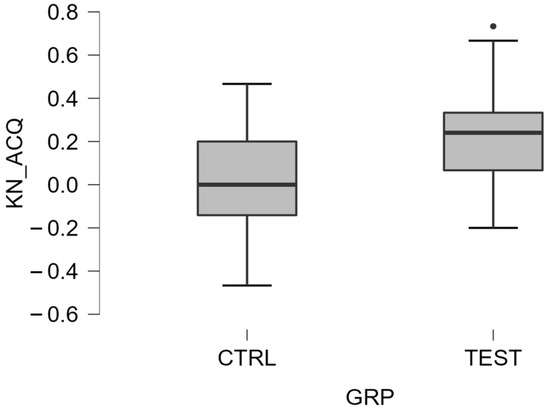 However, the knowledge acquisition (KN_ACQ) of the test group during the intervention is significantly higher (F (1, 92) = 24.3107.40, p = 3.6182 × 10−6, ω2 = 0.20) than in the control group (see Figure 6). Assuming the comparability of both groups, a random effect on the KN_ACQ variable of the test group between TOE1 and TOE2 can thus be excluded.