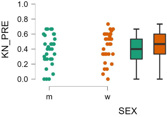 As can be seen in Figure 7, no significant differences in prior knowledge (KN_PRE) between the male and female participants within the test group could be found (F (1, 64) = 1.0857, p = 0.3013, ω2 = 0.00).