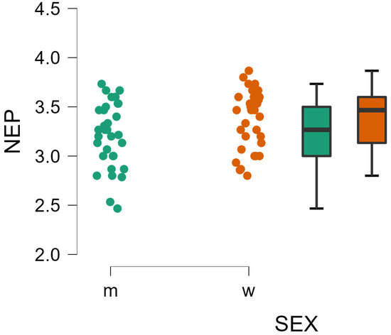 The NEP scale’s Cronbach’s α was 0.78. On average, the participants showed high endorsement of the NEP with M = 3.295. Female participants might have gotten slightly higher scores (see Figure 8), but in the ANOVA no significant gender differences were found (F (1, 64) = 3.6344, p = 0.0611, ω2 = 0.04).