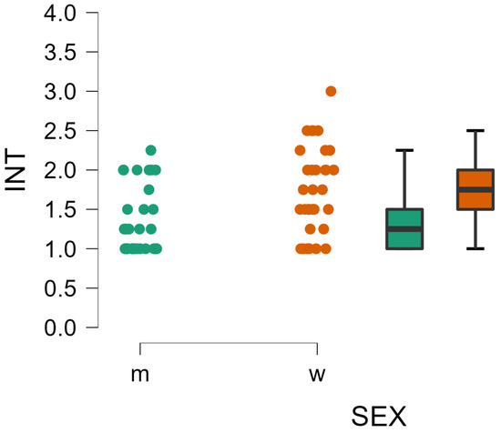 Significant gender differences could only be found for the intimidation scale, where females seemed to perceive stronger intimidation (INT) than males (F (1, 64) = 11.5123, p = 0.0012, ω2 = 0.14), as pictured in Figure 9. LOC (F (1, 64) = 2.8877, p = 0.0941, ω2 = 0.03) and BAE (F (1, 64) = 2.1974, p = 0.1432, ω2 = 0.02) did not differ significantly (see Figure 10).