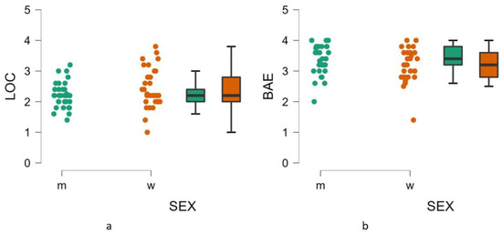LOC (a) and BAE scores (b) of male (m) and female (w) participants.