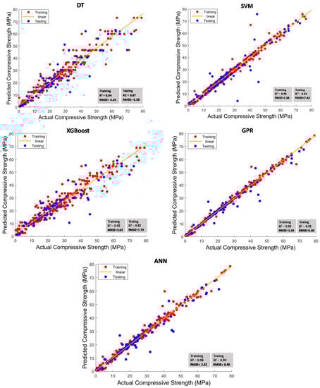 | 27. | Multiple linear regression (MLR), generalized linear modeling (GLM), quadratic polynomial regression (QPR), and support vector machine with linear kernel (SVML); non-linear models include artificial neural network (ANN), support vector machine with polynomial kernel (SVMP), support vector machine with radial kernel (SVMR), random forest (RF), and extreme gradient boosting (XGBoost) | 12,107 | Curing time and pretreatment condition | Compressive strength of field concrete at 7 days | [97] |